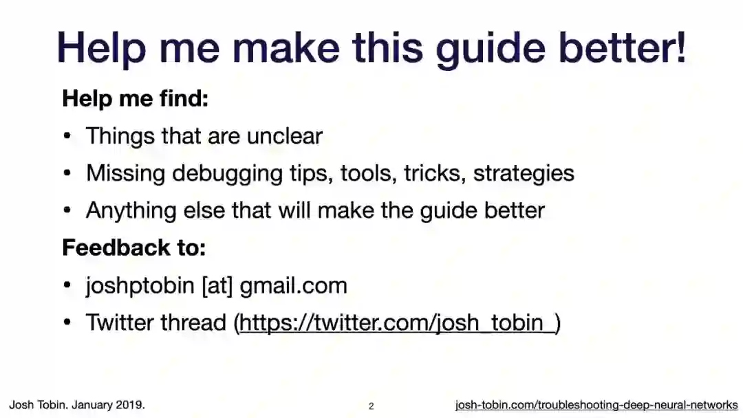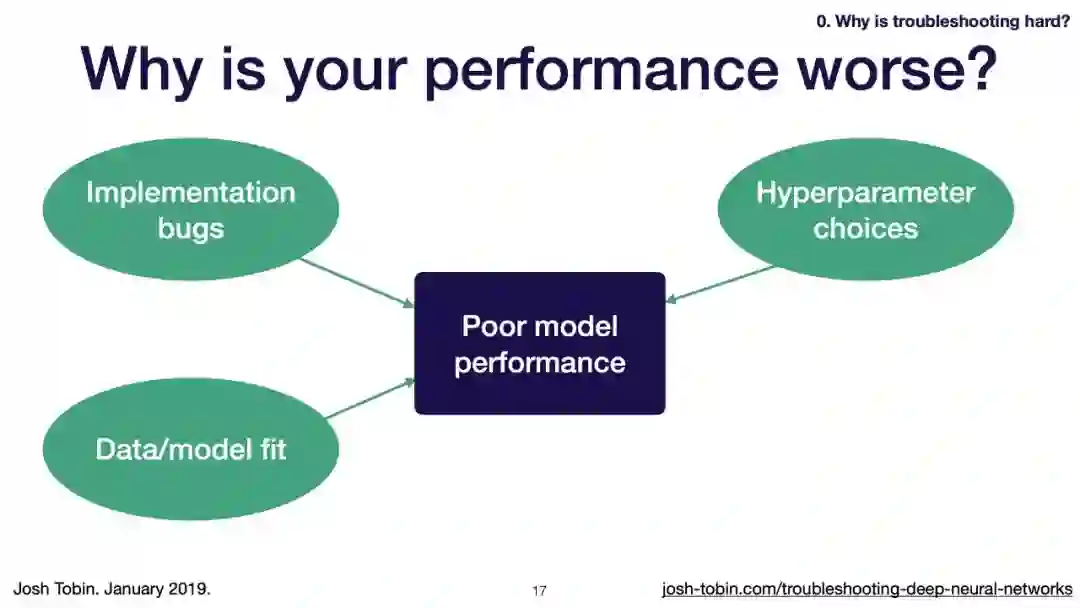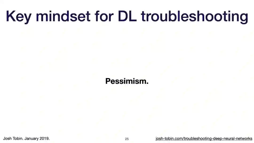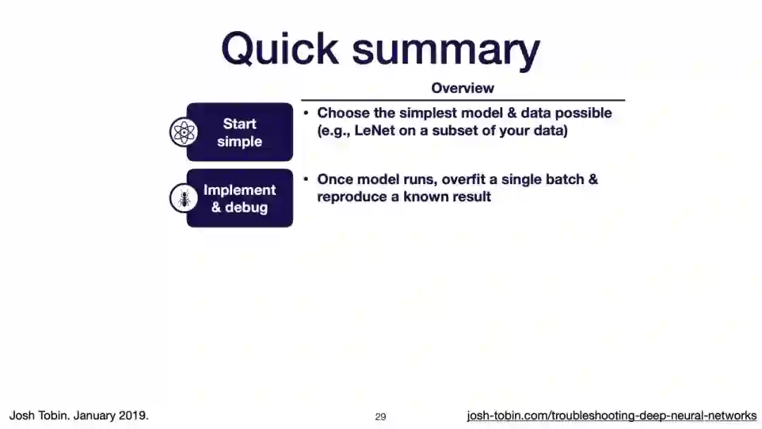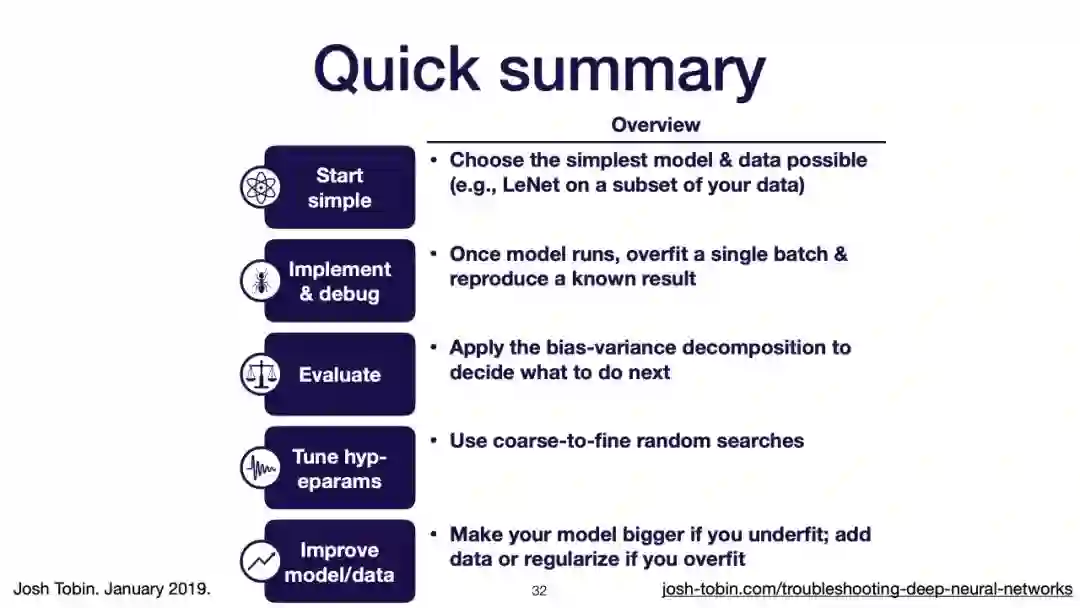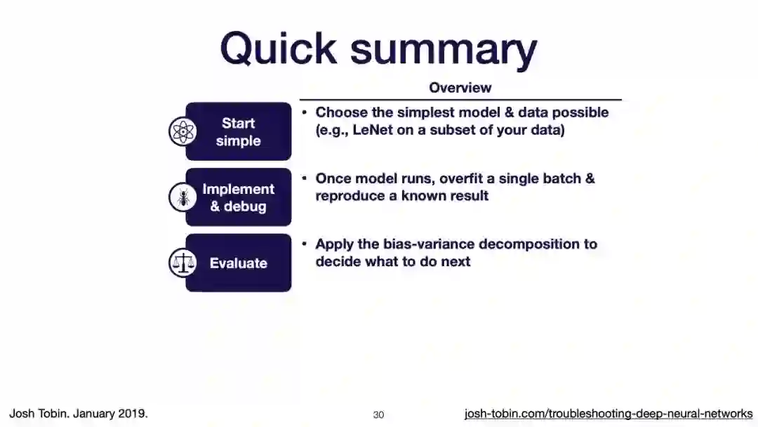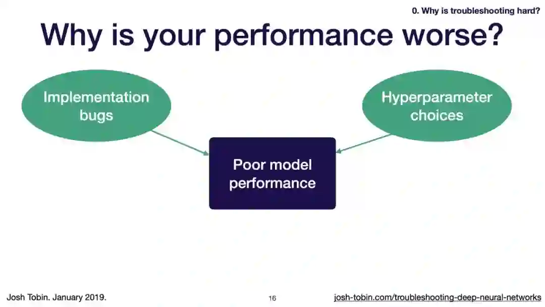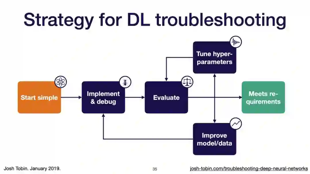 【导读】模型不work其实是很正常的事情,模型work才是不正常的事情[手动狗头]。不过,对于大神来说,这都不是事儿。来自OpenAI的大神Josh Tobin,有感于我等调模型幸苦,写了141页PPT,取名《Troubleshooting Deep Neural Networks - A Field Guide to Fixing Your Model》,旨在帮助萌新调整自己的深度神经网络。