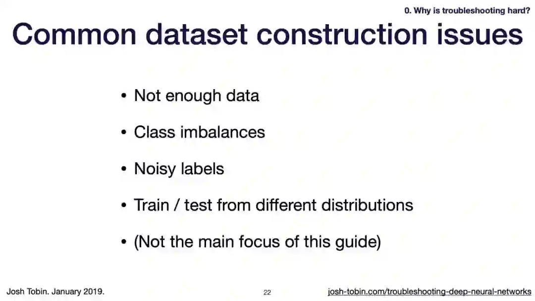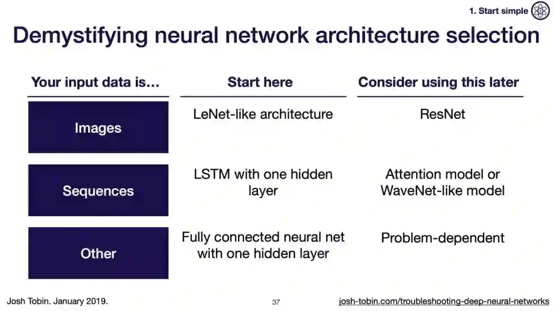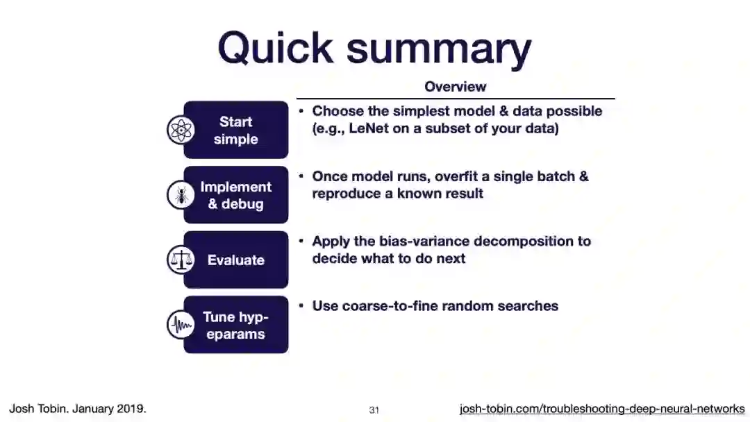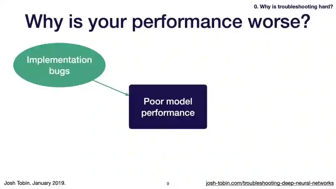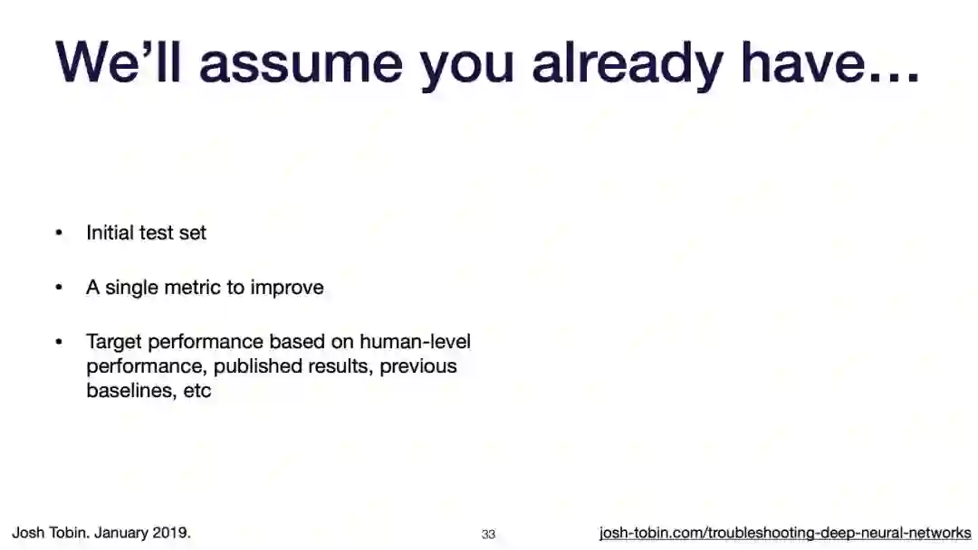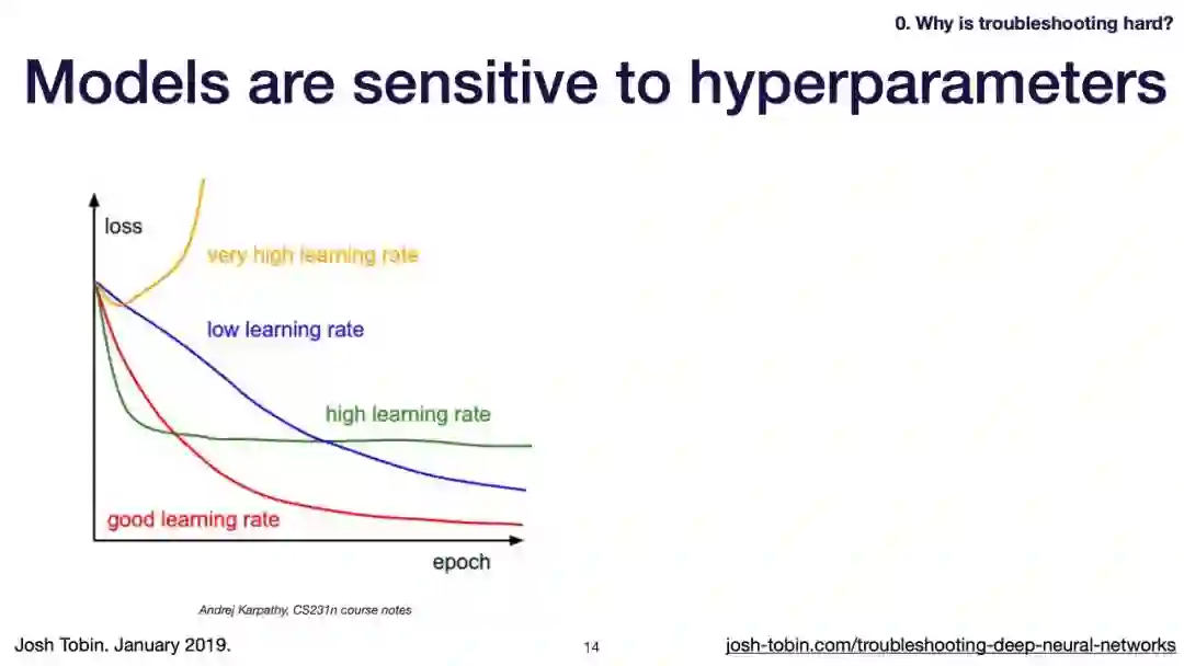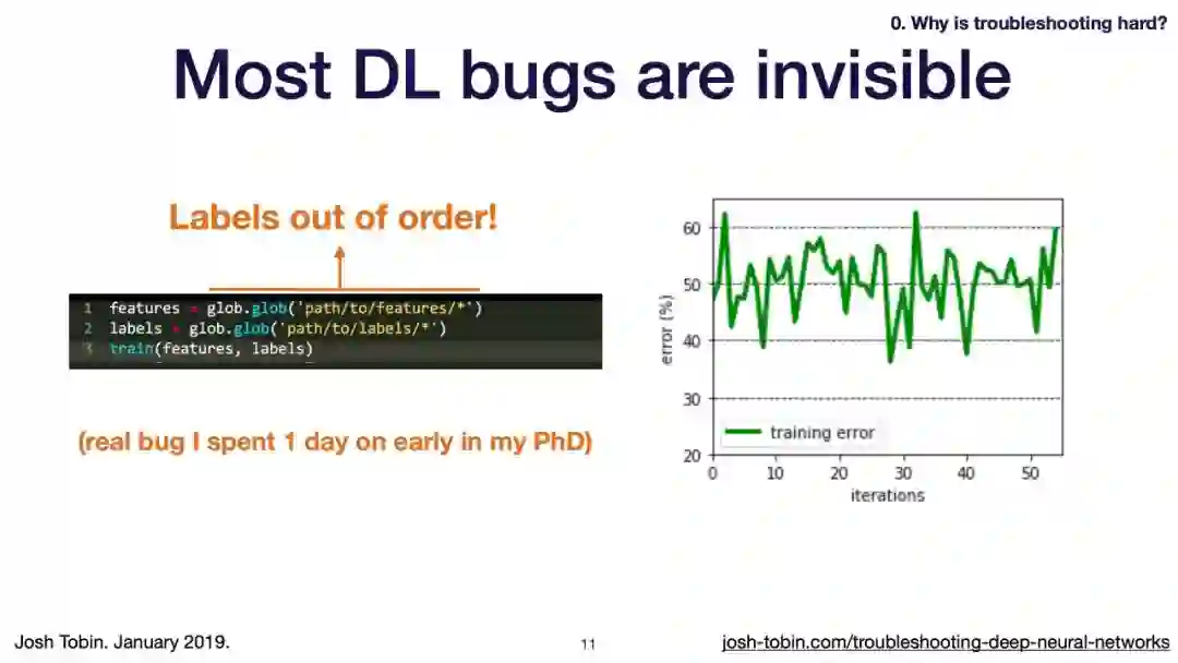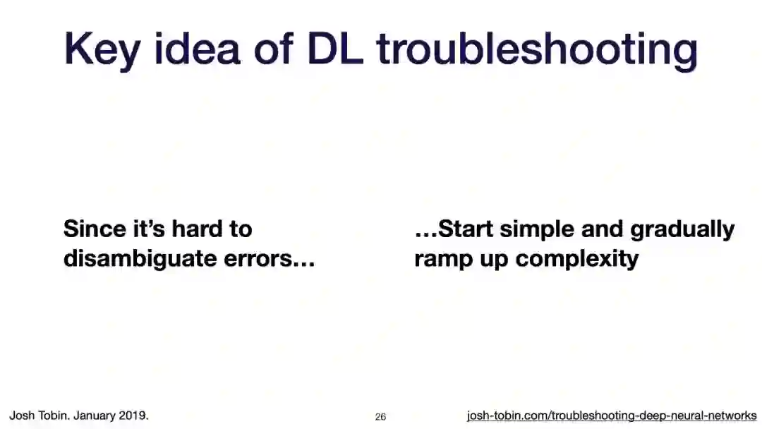 【导读】模型不work其实是很正常的事情,模型work才是不正常的事情[手动狗头]。不过,对于大神来说,这都不是事儿。来自OpenAI的大神Josh Tobin,有感于我等调模型幸苦,写了141页PPT,取名《Troubleshooting Deep Neural Networks - A Field Guide to Fixing Your Model》,旨在帮助萌新调整自己的深度神经网络。