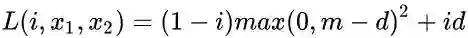 公式2为contrastive loss,x1 和 x2 为输入的图像样本对,i 为输入图像对的标签,i 为1表示是输入的图像对是正例对,i 为0表示是输入的图像对是反例对,m 表示反例对之间距离margin,d 为两个输入样本的欧式距离:。