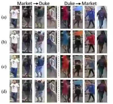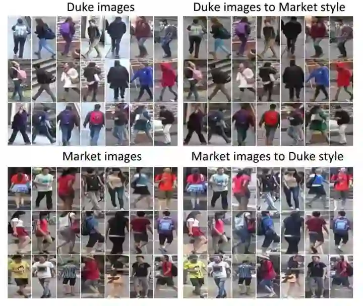 图2为分别来自于Duke和Market的图像示例,可以观察到两个数据集合有着很大的风格差异,具体体现在不同光照、背景、季节(duke拍摄于冬季、Market拍摄于夏季)等上。基于数据集合风格差异的观察,作者从图像风格迁移的角度来对re-ID的迁移学习进行探索: