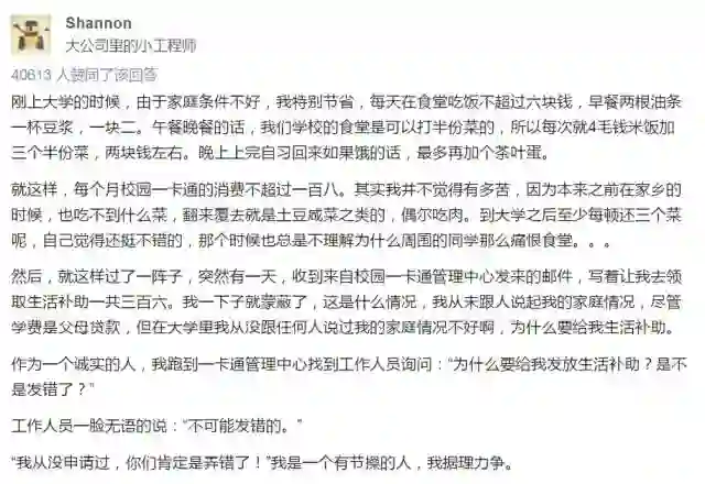 突然有一天,他收到来自校园一卡通管理中心发来的邮件,让他去领取生活补助一共三百六。但Shannon百思不得其解,他从未跟人说起我的家庭情况,为何学校会突然给他我生活补助?