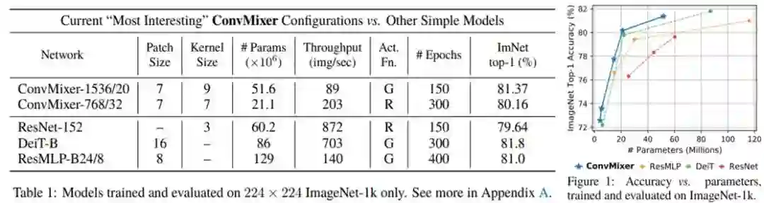 ConvMixers 模型和训练设置与 DeiT 非常相似。在最近的各向同性模型中,研究者认为 DeiT 和 ResMLP 是最公平的竞品模型,并且使用相同的过程训练了 ResNet(它的原始结果已经过时了)。从表 1 和下图 1 可以看到,ConvMixer 在给定的参数预算下实现了具有竞争力的结果:ConvMixer-1536/20 在使用明显更少参数的情况下,优于 ResNet-152 和 ResMLP-B24,并能够与 DeiT-B 竞争。不仅如此,ConvMixer-768/32 仅使用 ResNet-152 的 1/3 参数,就实现了与之相似的准确率。