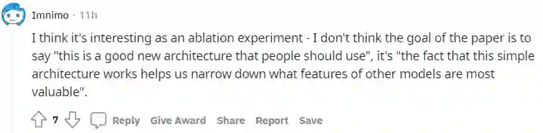 还有网友表示:「作为消融实验,我认为很有趣。我不认为这篇论文的目的是表达『 ConvMixer 是一个好的架构,值得研究者使用』,而是『这个简单的架构有效的帮助我们缩小了其他模型最有价值的特性范围』。」