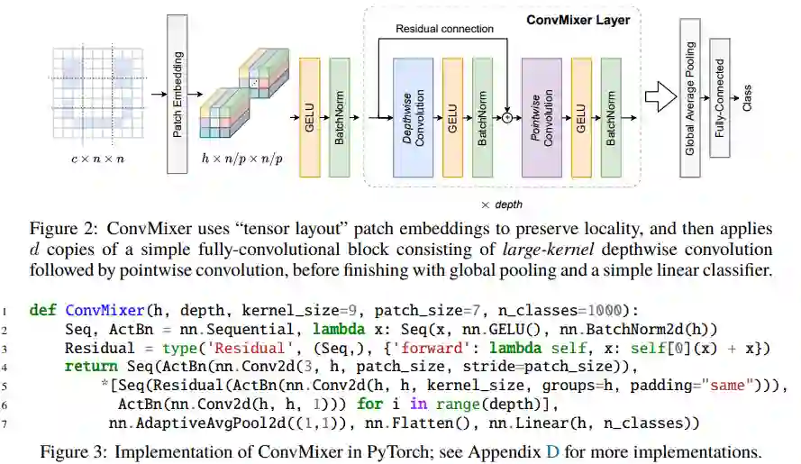 在本文中,研究者为后者提供了一些证据:具体而言,该研究提出了 ConvMixer,这是一个极其简单的模型,在思想上与 ViT 和更基本的 MLP-Mixer 相似,这些模型直接将 patch 作为输入进行操作,分离空间和通道维度的混合,并在整个网络中保持相同的大小和分辨率。然而,相比之下,该研究提出的 ConvMixer 仅使用标准卷积来实现混合步骤。尽管它很简单,但研究表明,除了优于 ResNet 等经典视觉模型之外,ConvMixer 在类似的参数计数和数据集大小方面也优于 ViT、MLP-Mixer 及其一些变体。