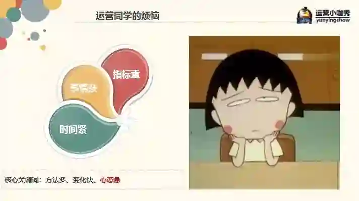 之前主办的同学跟我讲,大家很多都是从业一到三年的运营同学画像,很多时候可能会碰到最初我在前面提到的这些烦恼,就是压力大、方法多、变化快。