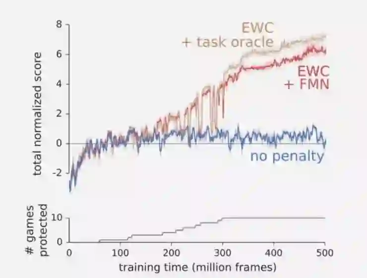 为了测试该算法,DeepMind 让程序不断尝试玩 Atari 游戏。据AI科技评论了解,单单从得分来学习一个游戏是一项具有挑战性的任务,但是依次学习多个游戏则更加困难,因为每个游戏需要单独的战略。如下图所示,如果没有 EWC 算法,程序会在游戏停止后快速将之前的事忘得一干二净(蓝色),这就意味着其实程序什么游戏都没学会。不过,如果用上 EWC 算法(棕色和红色),程序就不那么容易遗忘,且可以逐个学会多个游戏。