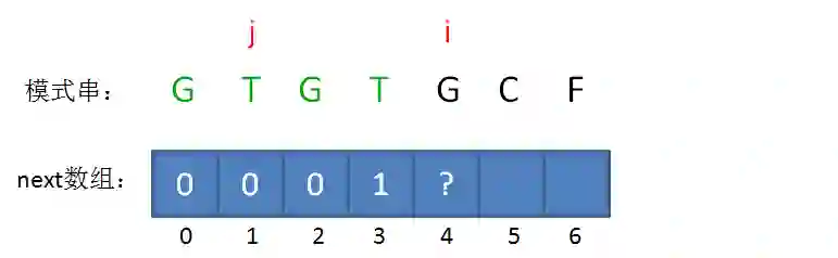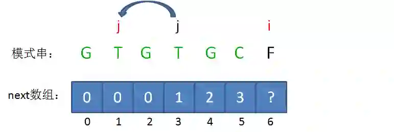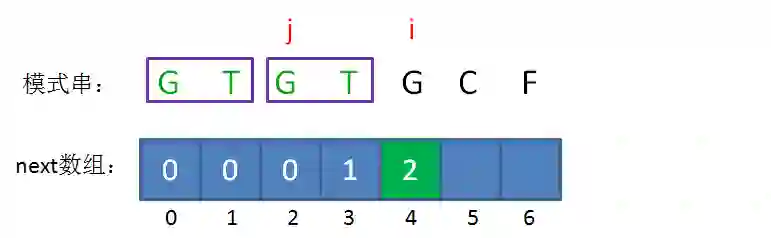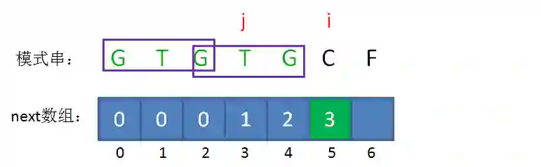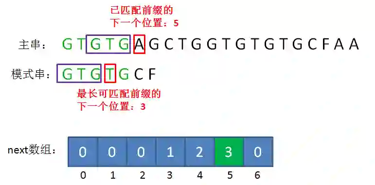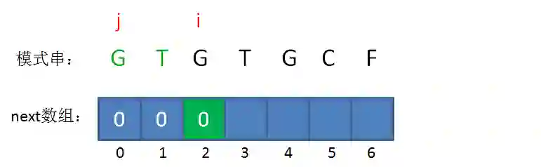 如果已匹配前缀是G、GT、GTGTGC,并不存在最长可匹配前缀子串,所以对应的next数组元素值(next[1],next[2],next[6])同样是0。