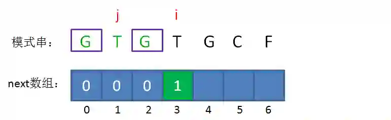 此时的已匹配前缀是GTG,由于模式串当中 pattern[j] = pattern[i-1],即G=G,最长可匹配前缀子串出现了,是G。
