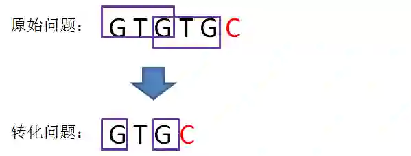 或许听起来有些绕:我们可以把计算“GTGTGC”最长可匹配前缀子串的问题,转化成计算“GTGC”最长可匹配前缀子串的问题。