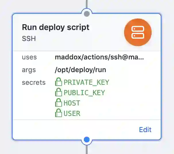 action "Run deploy script" {uses = "maddox/actions/ssh@master"args = "/opt/deploy/run"secrets = ["PRIVATE_KEY","HOST","USER"]}