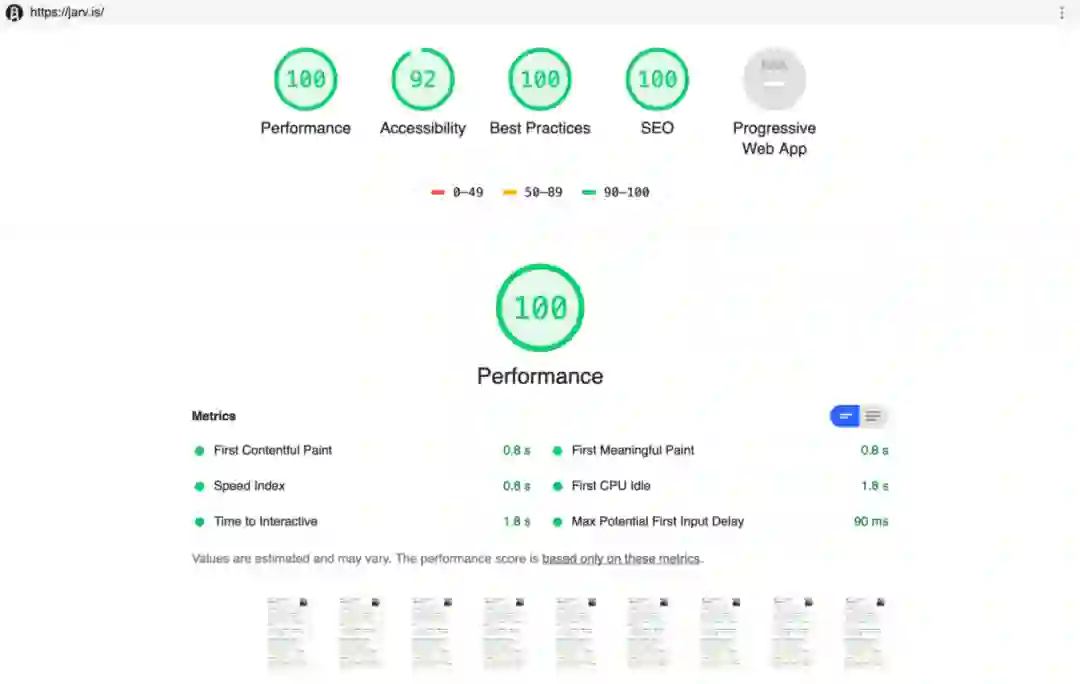 下面的工作流在 jarv.is 上运行一个 Lighthouse 审计,该步骤会在输出中显示 5 个分数,并上传结果 .html 和 .json的版本,以供下载(如上所示)。