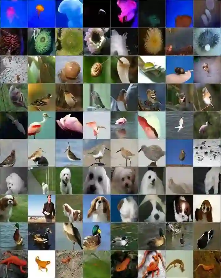 他们 256 像素的两级 ImageNet VQVAE 中的样本如下: