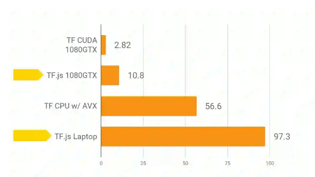 关于 TensorFlow.js 的性能,Google 官方做了一份基于 MobileNet 的评测,可以作为参考。具体评测是基于 MobileNet 的 TensorFlow 模型,将其 JavaScript 版本和 Python 版本各运行两百次,其评测结论如下。