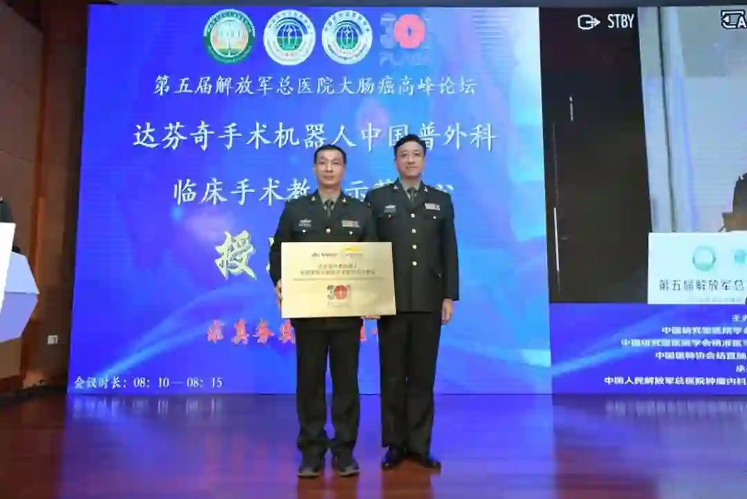 解放军总医院第一医学中心于启林主任、叶光荣政委出席了开幕式,并为普通外二科贾宝庆主任团队授予达芬奇手术机器人中国普外科临床手术教学示范中心。