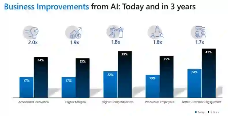 图 1:制造业通过人工智能获得的效益提升在当下和三年后的对比