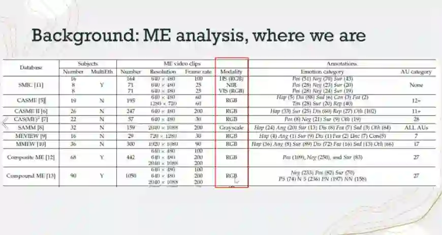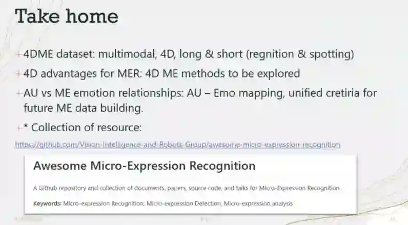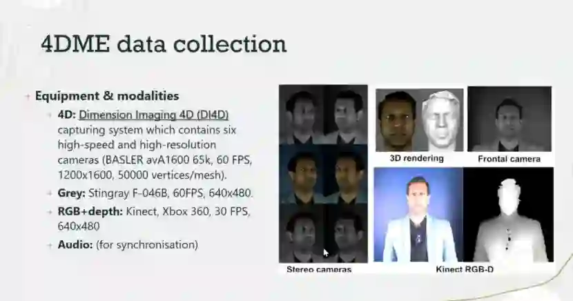 对普通面部表情的4D数据的研究已经取得了进展,但到目前为止还没有4D数据可用于微表情研究。在目前的研究中,李晓白博士介绍了4DME数据集:一个新的自发的微表情数据集,包括4D数据和其他三种视频模式。