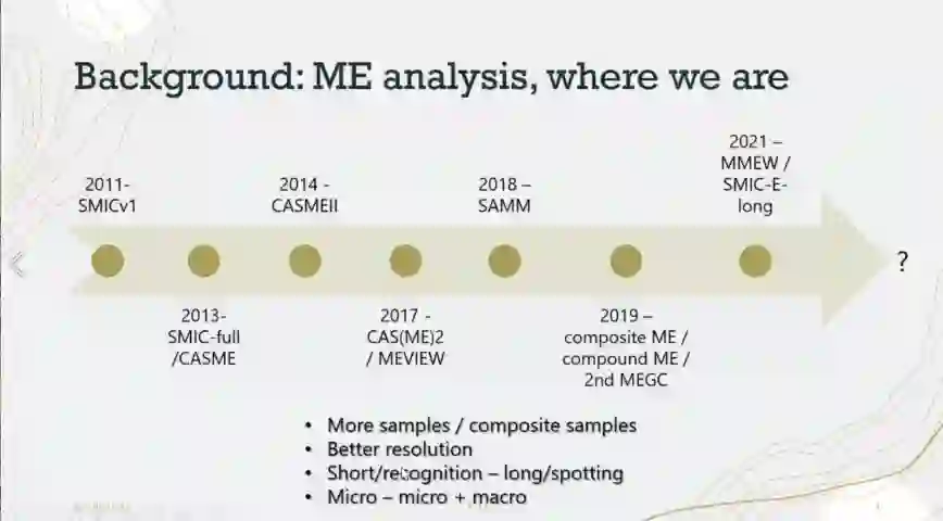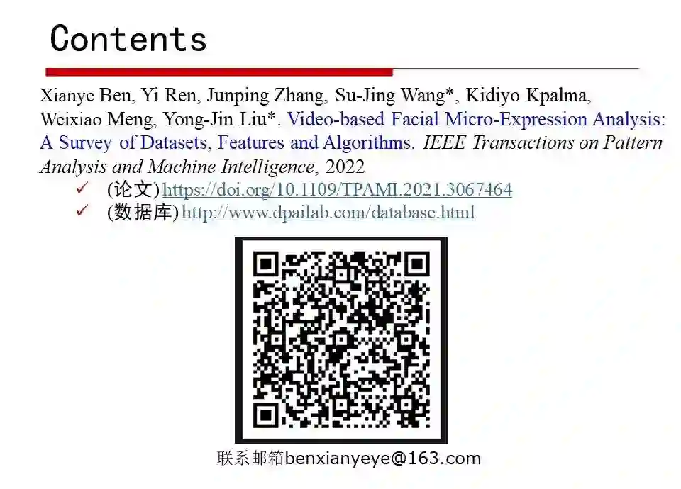微表情是一种短暂的、微弱的、无意识的面部微表情,持续时间往往在0.5s内,能够揭示人类试图隐藏的真实情绪。微表情识别的研究旨在让机器有足够的智能,能够从人脸视频序列中识别人类的真实情绪。然而由于微表情持续时间短、面部肌肉运动强度低,对其进行准确的表征与识别是一项极具挑战性的任务。为了促进心理学领域和计算机视觉领域针对微表情的进一步研究,由中国图象图形学学会(CSIG)和中国科学院心理研究所主办、CSIG机器视觉专业委员会和CSIG情感计算与理解专业委员会联合承办,中国科学院心理研究所的王甦菁博士组织了一系列云上微表情的学术活动。
