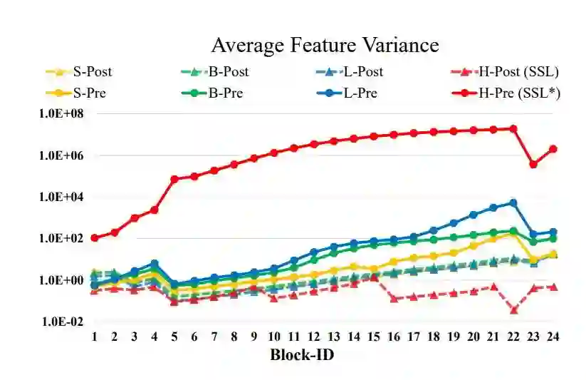 仔细观察原始 Swin Transformer 的架构,研究员们发现这是由于残差分支的输出直接加回主分支而导致的。原始的 Swin Transformer(以及绝大多数视觉 Transformer)在每个残差分支的开始都使用了预归一化(pre-normalization),它可以归一化输入的幅值,但对输出没有限制。在预归一化下,每个残差分支的输出激活值会直接合并回主分支,并被逐层累加,因而主分支的幅值会随着深度的增加而越来越大。这种不同层的幅值差异很大程度上导致了训练的不稳定性。