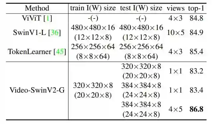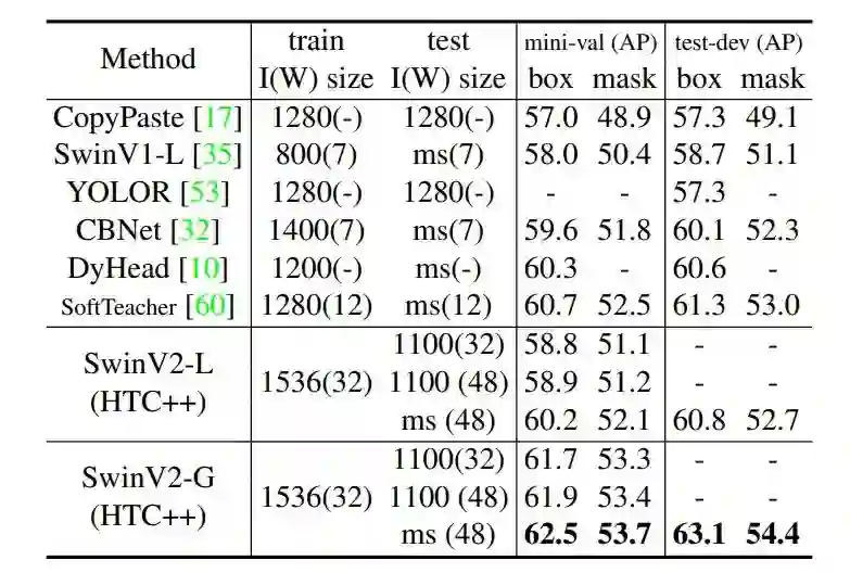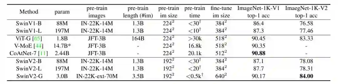 通过扩展模型容量和分辨率,Swin Transformer v2.0 在四个具有代表性的基准上均刷新了纪录,证明了视觉大模型在广泛视觉任务中的优势:在 ImageNet-V2 图像分类任务上 top-1 准确率为84.0%;在 COCO 物体检测任务上为63.1/54.4 box/mask mAP;在 ADE20K 语义分割上为59.9 mIoU;在 Kinetics-400 视频动作分类的 top-1 准确率为86.8%。
