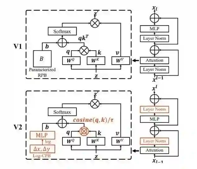 除此之外,研究员们还发现,随着模型变大,在原始的自注意力计算中,某些层的注意力权重往往会被几个特定的点所支配,特别是在使用后注意力的情况下。为了缓解这一问题,研究员们还提出了缩放的余弦注意力机制(scaled cosine attention),它可以取代之前的点乘注意力机制。在缩放的余弦注意力机制中,自注意力的计算与输入的幅值无关,从而可以产生更温和的注意力权重。