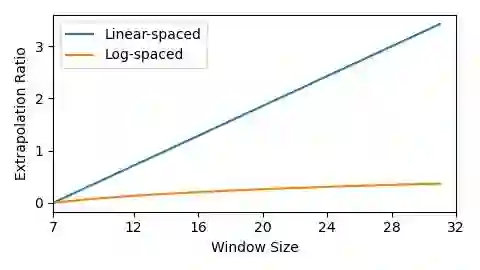为了解决这一问题,研究员们提出了对数空间的连续位置偏置(Log-spaced continuous position bias, Log-spaced CPB)。通过对对数空间的位置坐标应用一个小的元网络,Log-spaced CPB 可以产生任意坐标范围的位置偏置。由于元网络可以接受任意坐标,因此通过共享其权重,一个预训练好的模型可以在不同的窗口大小之间自由迁移。另一方面,通过将坐标转化到对数空间,在不同的窗口分辨率之间迁移所需的外推率要比使用原始线性空间坐标的外推率小得多,如图4所示。