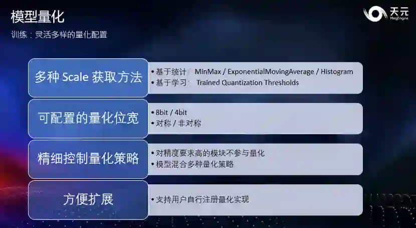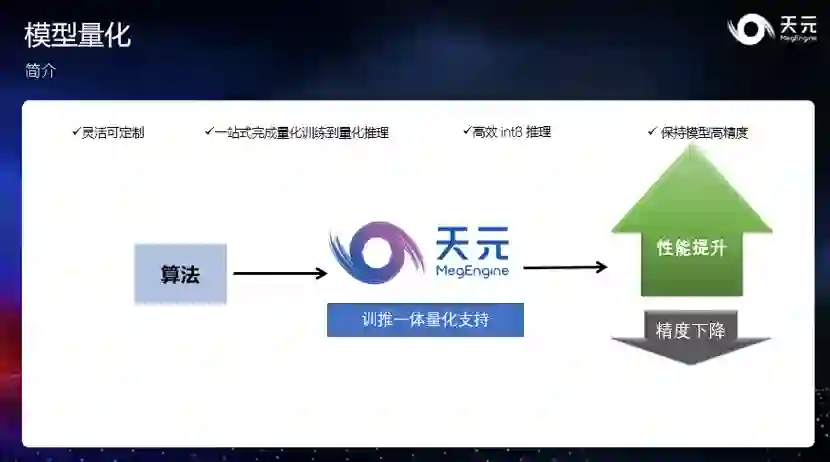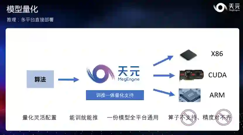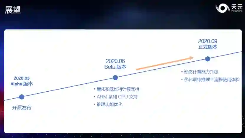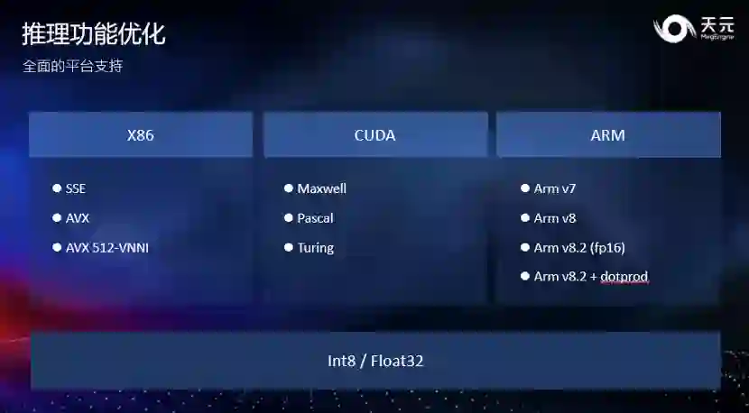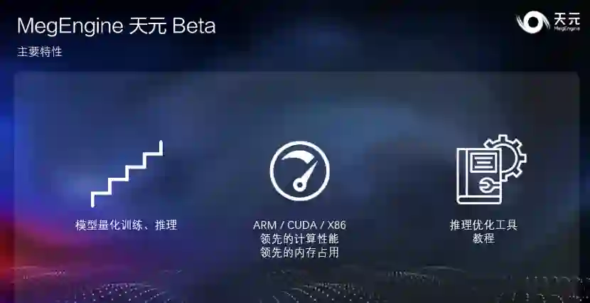1. 完善量化训练和量化推理功能。天元 Beta 版本提供了灵活的量化训练和高效的量化推理的能力,让开发者可以快速的完成高精度的量化训练并直接部署到推理侧,以最小的精度代价获得最高的推理性能。 2. 添加对 ARM CPU 的支持。天元添加了对 ARM CPU 的支持,在 ARM、CUDA、X86 三个主流计算平台上都提供了经过深度优化的 kernel 实现,结合天元优异的计算图优化技术,在量化、浮点模型上均提供了业界领先的计算性能和内存显存占用。 3. 优化推理功能。天元对推理功能做了一系列的功能优化,提供 Profile 工具、上手指南、性能优化教程等内容,帮助开发者快速上手,获得更高的推理性能,让开发者在推理的时候可以使用更方便,开发更高效。 另外,天元 Beta 版新增 10 余个 SOTA 模型,并正式提供中文版 API 文档,还新增了 Objects 365 Dataset 的 API 和多机训练参数打包等功能。 除了功能和性能上的改进之外,天元框架还与小米 MACE、OPEN AI LAB(开放智能)Tengine 等推理框架进行了深度集成。