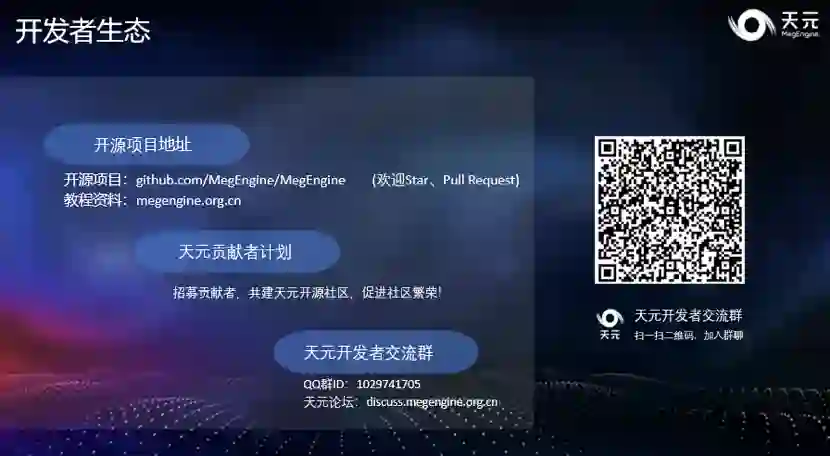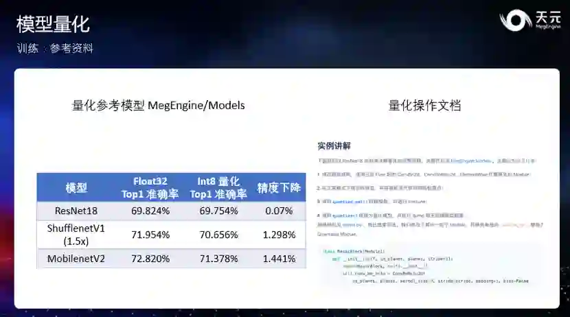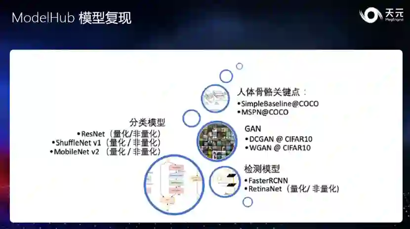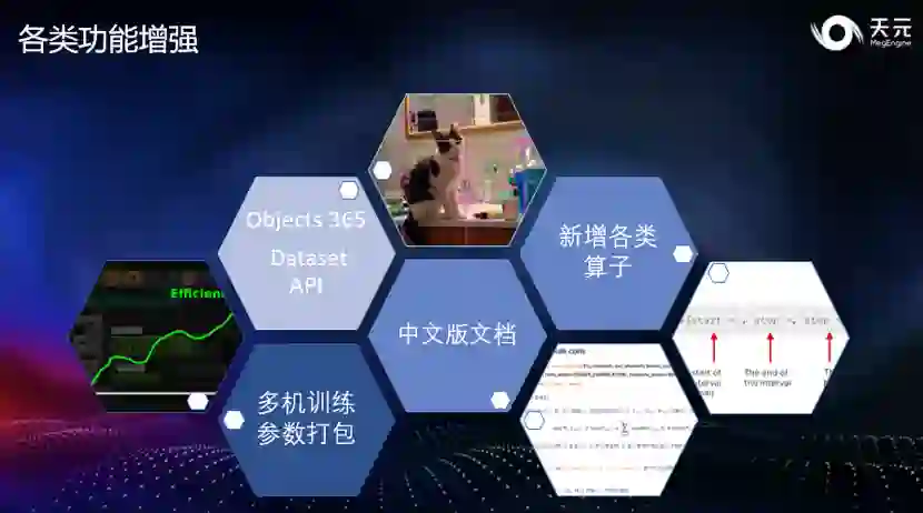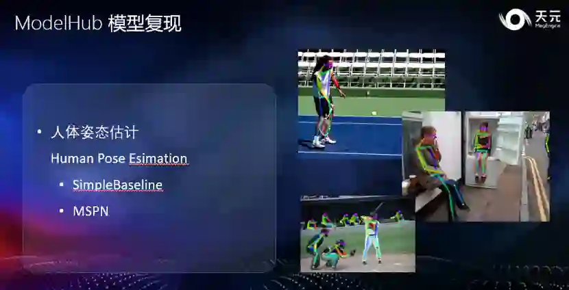 除了 NN 算子之外,在深度学习模型应用的场景中,各类 CV(也就是图像处理)算子往往也作为模型的预处理步骤存在,这些步骤的性能和精度会高度影响一个深度学习模型的落地效果。天元内置了常用的 CV 算子,并进行了高度优化,它们可以作为模型的一部分存在,实现框架的统一优化。在推理时,解码后的结果可以直接输入框架,通过一次调用完成全部 CV 操作和 NN 算子,简单方便。在深度学习模型的落地中,一个重要的步骤称为 “对分”,它能确保模型训练与最终推理的行为完全一致。天元提供的 CV 算子在各平台间对齐精度,尽全力避免训练与推理的差异,降低其中的误差,从而显著降低对分的成本,助力模型快速落地。新增复现模型与训练功能增强 除本次核心技术升级外,天元也一直在更新更多模型复现,助力开发者利用天元完成更多工作。