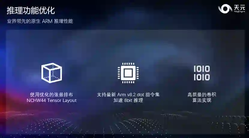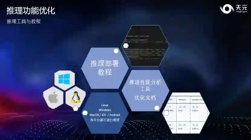 配合本次 ARM 能力的放出,天元在官网上提供了完整的部署流程教程,帮助大家快速上手端侧推理的开发步骤。 另外,天元也进一步优化了推理方面的使用体验,提供性能分析工具和优化手册,方便开发者找到性能瓶颈,提高模型推理性能。 最后天元针对跨平台编译进行优化,开发者可以利用天元在 Linux / Windows /macOS / iOS / Android 上进行推理。各平台内置常用图像处理算子