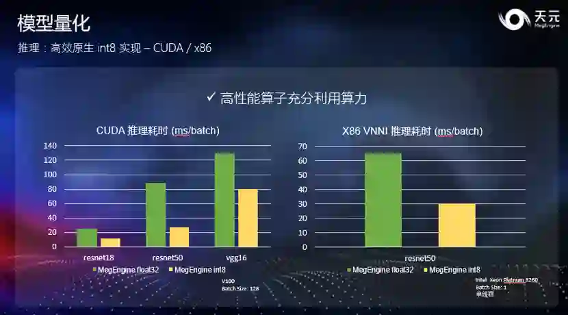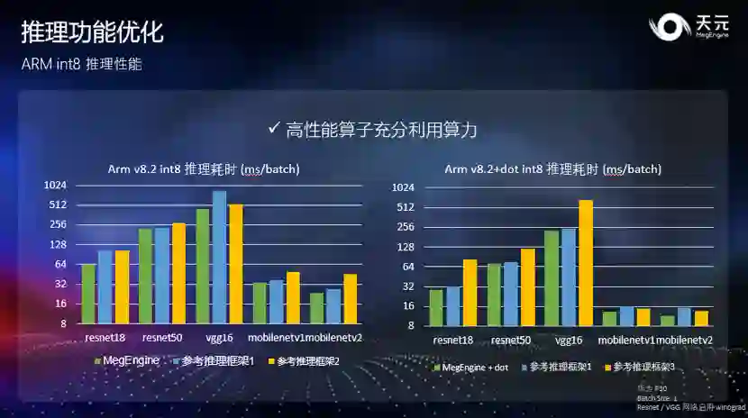 上图展示了 ARM 上的推理性能对比。可以发现,通过转换至 int8,天元使得常用网络获得了至多 3 倍的提速。此外,针对手机上常用的小模型,天元提供了更好的优化效果,加速效果更加明显。