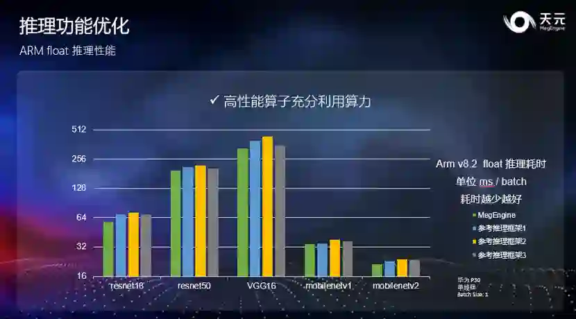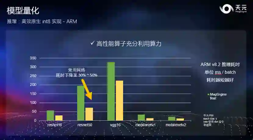 此外,天元在 CUDA 和 x86 上也提供相对于 float32 显著的提速效果。与 Arm 类似,int8 推理的耗时仅有 float 模型的 30%~50%。在 CUDA 上,天元可以充分发挥出 Tensor Core 的计算能力,榨干显卡的计算能力;而在 X86 上,由于 X86 指令集的原因,天元可以在支持 AVX512-VNNI 指令集的最新一代处理器上得到比较明显的 int8 提速。综上,原生的 int8 高效推理性能,可以让开发者方便地进行模型推理部署,同时充分发挥出硬件的计算能力。 推理功能优化 业界领先的原生 ARM 推理性能