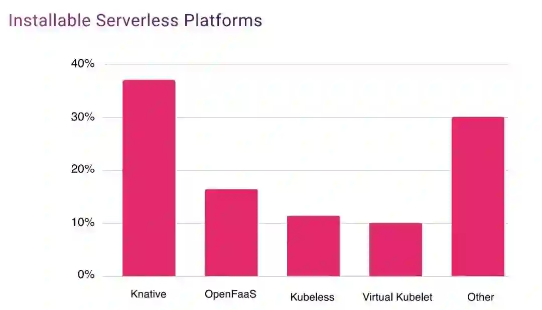 如图所示, Knative 占据了 34% 的份额,遥遥领先于第⼆名 OpenFaaS,Knative 是搭建 Serverless 平台的首选。( 数 据 来 源 于 CNCF 2019 年 社 区 调 查 报 告 )
