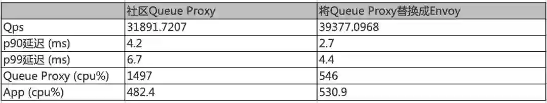 使用 Envoy 替换 Queue Proxy 可将 QPS 额外提升 12%,单位 CPU 百分比支撑的 QPS 基本一致