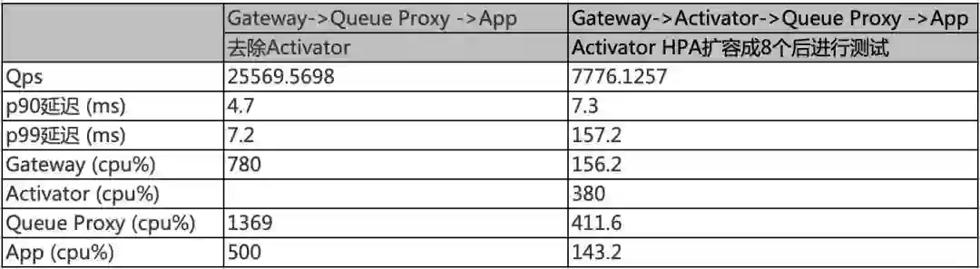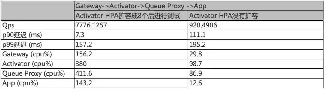 Activator 加⼊到数据路径中,在没有扩容情况下,性能⾮常差 QPS 只有 920,经过 HPA 扩容成 8 个后,QPS 可达 7776.1257