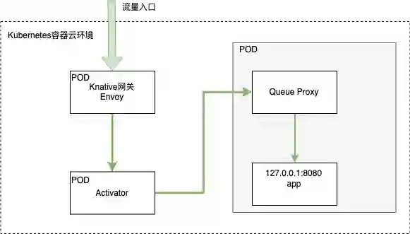 冷启动充当看门人,业务 POD 0-1 流量会经过 Activator 组件