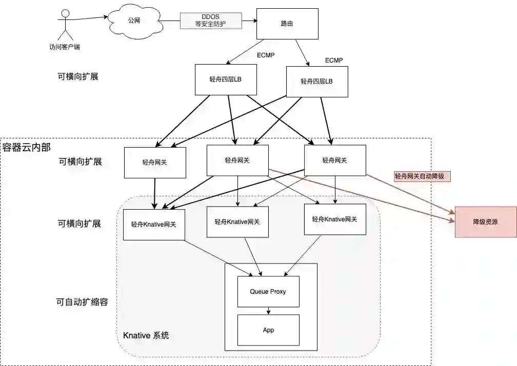 因为方案降级需求,轻舟网关需要连云外的降级资源,但 Knative 网关无法管理该云外资源,所以目前无法将 Knative 网关和轻舟网关融合成一个网关。未来 Serverless 平台不再需要云外的降级资源,再将轻舟网关和轻舟 Knative 网关合并,达到如下流量框架,进一步缩短流量路径,达到最佳性能。