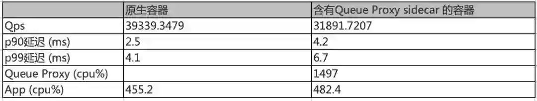 经过前文的分析 Queue Proxy 以 Sidecar⽅式存在是 Knative 架构要求,当前测试 case 情况下,加⼊Queue Proxy Sidecar 后,相⽐原⽣容器,QPS 从 3.9w->3.1w,P90 延迟翻倍(2.5->4.2)。
