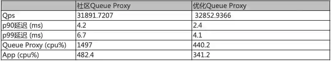 优化 Queue Proxy HTTP 代理解析过程,延迟大幅度降低(4.2->2.4 ms),且 CPU 使用率大幅度降低(代理 CPU 使用率接近 Server CPU 使用率),QPS 小幅度提升。