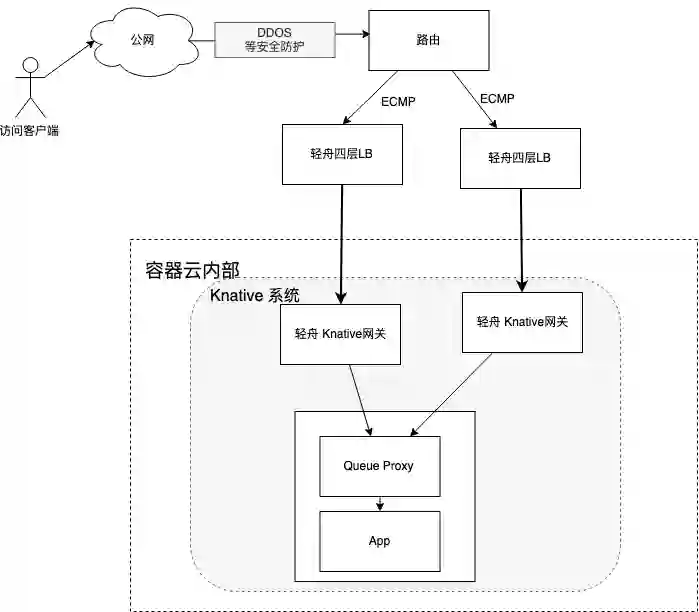 在选型之初,我们打算按照如下架构图,流量接入到 Knative 系统。流量经过 Nginx Https 代理 -> 轻舟网关 -> 轻舟 Knative 网关 -> Queue Proxy -> 业务 App,其中: