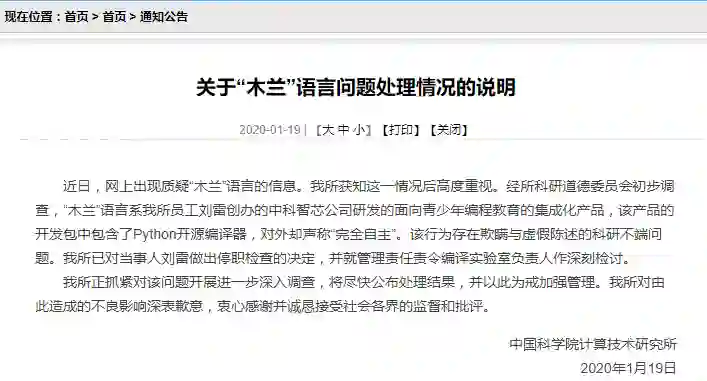 1月19日,中科院计算技术研究所通报:“经所科研道德委员会初步调查,“木兰”语言系我所员工刘雷创办的中科智芯公司研发的面向青少年编程教育的集成化产品,该产品的开发包中包含了Python开源编译器,对外却声称“完全自主”。该行为存在欺瞒与虚假陈述的科研不端问题。我所已对当事人刘雷做出停职检查的决定,并就管理责任责令编译实验室负责人作深刻检讨。”