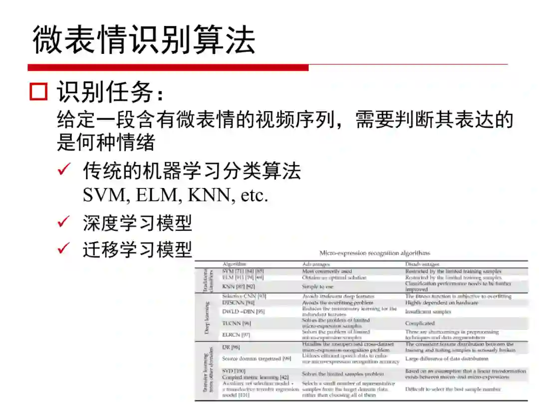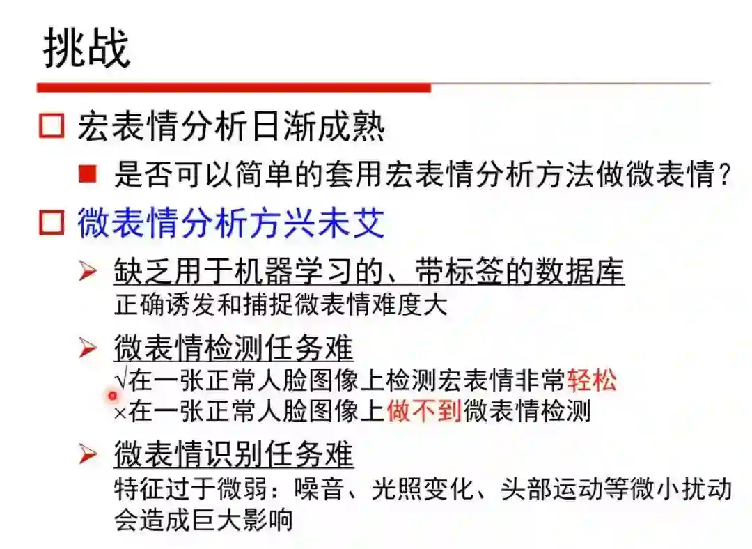 在这一部分,刘教授首先针对微表情提出了目前面临的三大挑战:缺乏数据库、微表情检测任务难、微表情识别任务难。微表情的分析任务和宏表情相关,但是是一个有特定难度的研究领域。