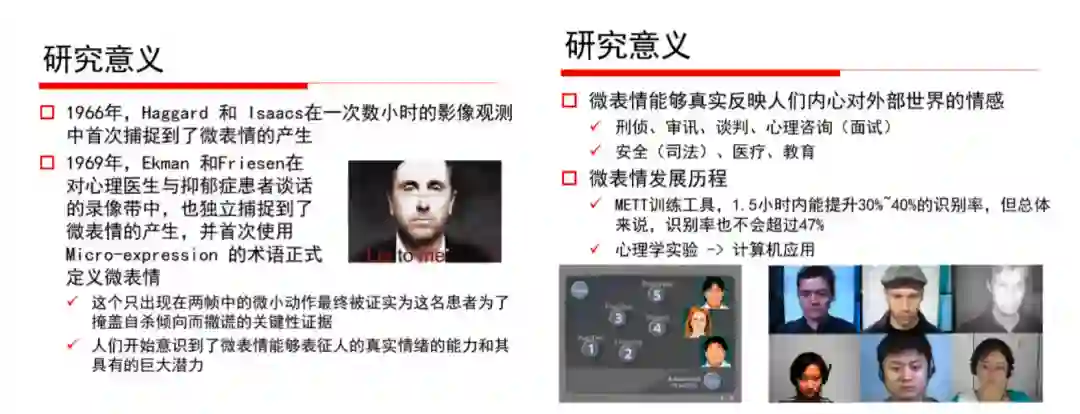 进而,刘教授通过比较宏表情和微表情的特性,体现了微表情特征难以提取的特点,进而提出了基于视频的微表情数据的重要性。