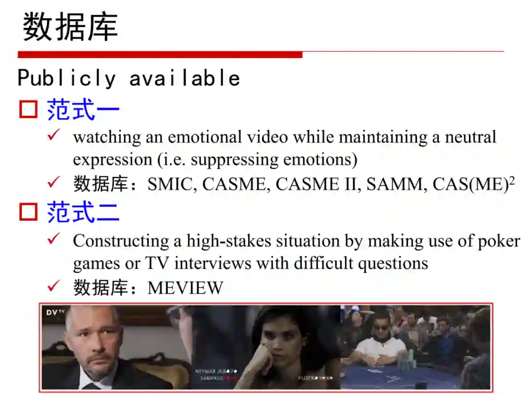 个体在控制面部肌肉做出表情的存在如下图所示的神经通路,包括一个自发的不受控制的通路和一个由个体主动去控制的通路。微表情的诱发需要一个高风险的场景,这个场景可以引发被试强烈的情绪反应,但是被试需要努力控制住表情,从而不流露出情绪。在这种高风险的场景下,两种通路在互相冲突,个体一方面会无意识地呈现出表情,另外一方面个体会控制自己不表现出相应表情。在这种特定的条件下,双方在博弈时,无意识表现占据上风的情况下,最后会泄露出来一些微弱的表情。这种微表情的表达方式对其后续的实际应用非常有价值。