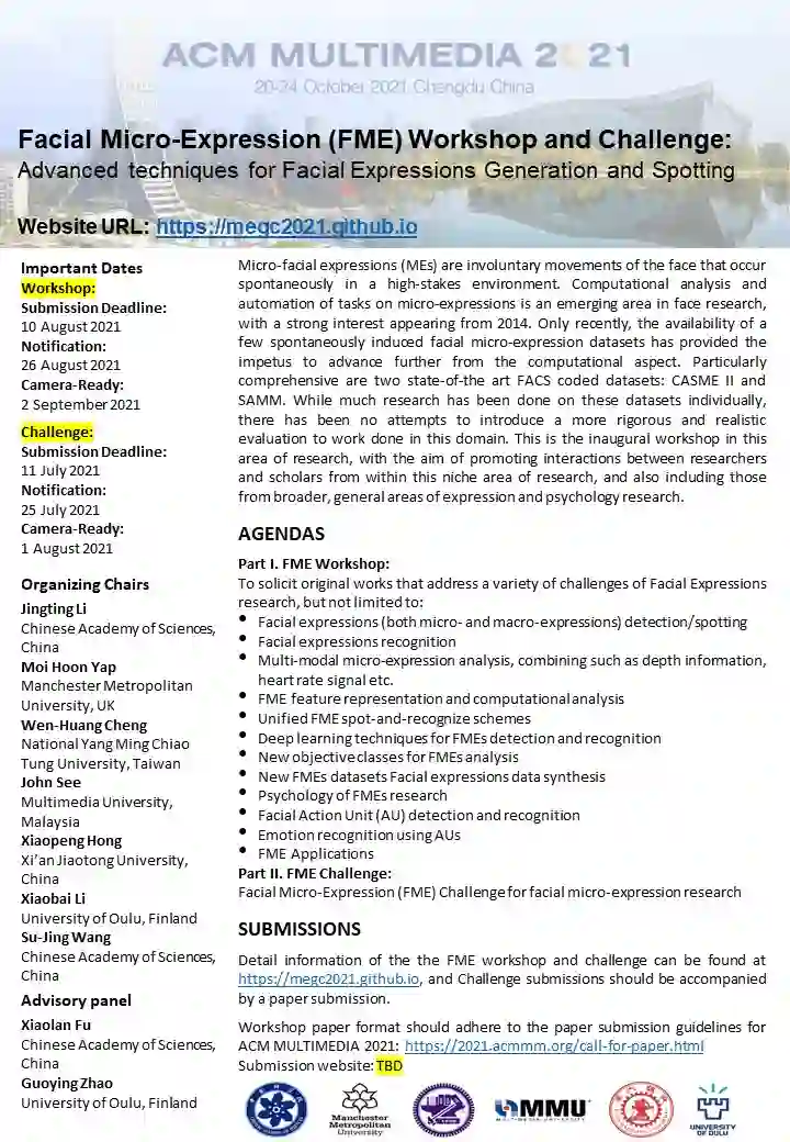 微表情是一种短暂的、微弱的、无意识的面部微表情,持续时间往往在0.5s内,能够揭示人类试图隐藏的真实情绪。微表情识别的研究旨在让机器有足够的智能,能够从人脸视频序列中识别人类的真实情绪。然而由于微表情持续时间短、面部肌肉运动强度低,对其进行准确的表征与识别是一项极具挑战性的任务。为了促进心理学领域和计算机视觉领域针对微表情的进一步研究,由中国图象图形学学会(CSIG)主办、CSIG机器视觉专业委员会承办,中国科学院心理研究所的王甦菁博士组织了一系列云上微表情的学术活动。