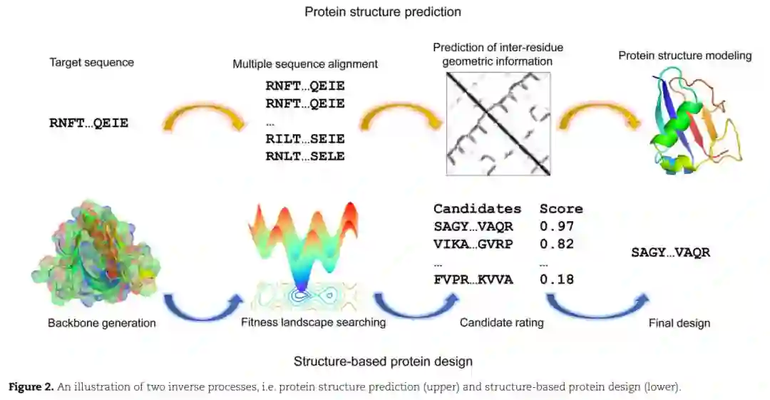 基于结构的蛋白质设计可以看作是蛋白质结构预测的逆过程。对于后者,需要为给定的序列建模一些潜在的结构,而对于前者,需要为设计好的拓扑结构的主干优化一些可行的序列(图2)。蛋白质同源性在蛋白质结构预测中起着重要的作用,为精确推断提供了大量的进化信息。近年来,深度学习在很多方面对蛋白质结构预测产生了革命性的影响,从早期的蛋白质残基间接触预测和接触辅助结构建模[31,53 - 57],到后来对残基间几何性质和基于几何约束的蛋白质折叠的精确预测[32,58 - 62]。此外,谷歌DeepMind开发的具有最先进的端到端训练程序的注意力网络在第十四届CASP (Critical Assessment of protein Structure Prediction)实验中为单结构域蛋白质的结构预测提供了极好的解决方案,震惊了公众[63-65]。用于蛋白质结构预测的深度学习技术,如卷积神经网络,可以有效地从多序列比对中蕴含的协同进化信息中捕获折叠级结构特征[66]。这些成果加深了我们对蛋白质序列-结构关系的理解,这也是基于结构的设计的基础,并提供了一系列可以直接用于设计问题的实用工具。除了通过结构预测的进步对蛋白质设计的环境改进外,定制化深度学习方法也直接对蛋白质设计做出了相当大的贡献。针对不同设计阶段不同设计目标的新型网络架构、训练程序和数据操作不断涌现,有力地推动了蛋白质的探索。我们将详细说明这些新特性,说明这些方法与传统的基于知识的方法之间的区别,并在以下部分阐明相应的意义。