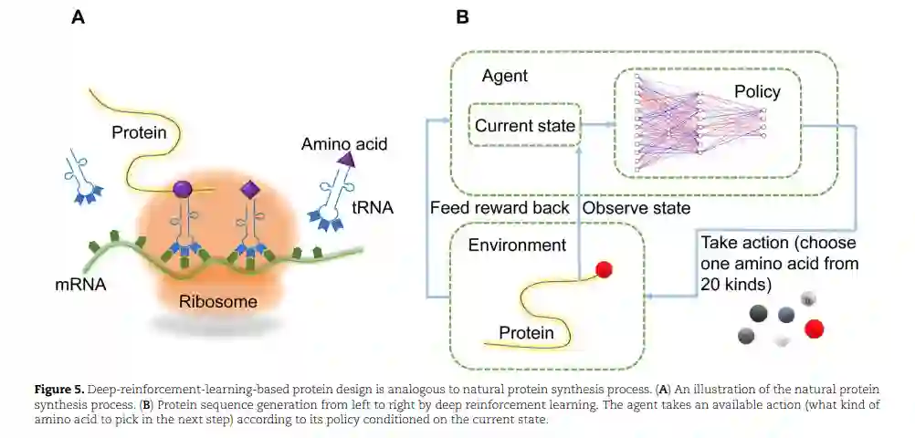 基于深度强化学习的蛋白质设计方法就像自然蛋白质合成过程的计算机模拟(图5),随着更先进技术的应用,这些方法可以帮助我们挖掘更多蛋白质的内在原理,得到更多高质量的功能蛋白质材料。例如,DyNA PPO[132]就是基于proximalpolicy优化[133]的深度强化学习模型,用于序列设计。该模型从左到右依次生成氨基酸序列,整个过程被视为一个马尔可夫决策过程。在序列生成完成之前,对agent的奖励保持为0。在每一轮结束时,一组试图近似替代适应度函数的机器学习模型给出的序列适应度测量作为最终奖励。DyNA PPO通过使用一堆模型来学习序列适应度环境的不同方面,但只使用最合适的、具有足够精度的模型来更新其策略,从而平衡了奖励估计中的权衡。虽然DyNA PPO的优越性已经在多个方法的大规模基准测试中得到了证明,但该报告并没有通过湿实验室实验进行任何验证。因此,其实用性还需要在未来的研究中得到验证。此外,强化学习可以用来微调一些预先训练的生成模型的蛋白质设计。例如,RNN通过基于策略的强化学习方法进行调整,以生成理想的化合物[134]。这项研究最重要的启示是降低灾难性遗忘风险的尝试和成功[135],这是蛋白质生成模型的一个常见问题。