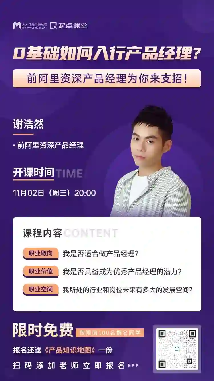 我们特邀前阿里资深产品经理@谢浩然老师带你重塑产品岗位认知,1小时解读职业规划中的职业取向/价值/空间三大关键问题!