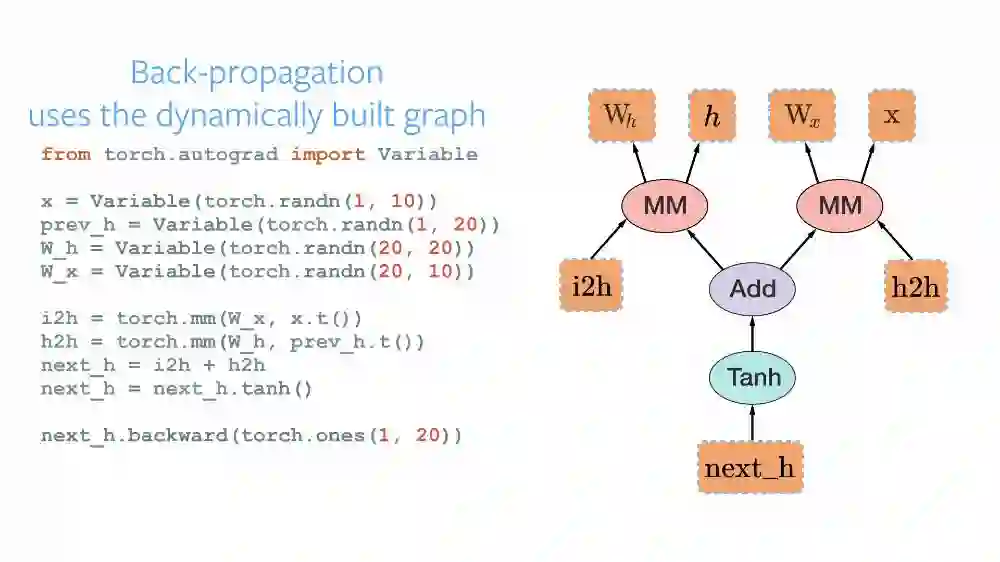除了GPU加速和内存使用的高效外,PyTorch受欢迎的主要因素是动态计算图的使用。已经有其他一些不太知名的深度学习框架使用动态计算图,例如Chainer。动态图的优点在于,图(graph)是由run定义(“define by run”),而不是传统的“define and run”。特别是,在输入可以变化的情况下,例如文本这样的非结构化数据,这非常有用而且高效。