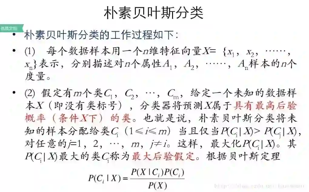 朴素贝叶斯(Naive Bayesian)是基于贝叶斯定理和特征条件独立假设的分类方法,它通过特征计算分类的概率,选取概率大的情况,是基于概率论的一种机器学习分类(监督学习)方法,被广泛应用于情感分类领域的分类器。