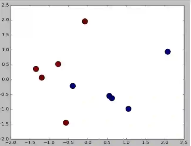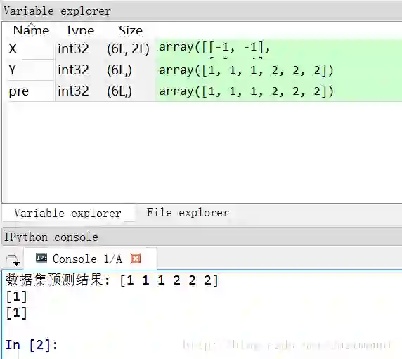 下面随机生成六个坐标点,其中x坐标和y坐标同为正数时对应类标为2,x坐标和y坐标同为负数时对应类标为1。通过高斯朴素贝叶斯分类分析的代码如下: