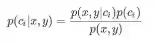 其中,x、y表示特征变量,ci表示分类,p(ci|x,y)表示在特征为x,y的情况下分入类别ci的概率,因此,结合条件概率和贝叶斯定理有: